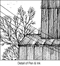 on a transparency and exposed the solar plate to the aquatint screen and then to the transparency image. The plate was then developed by washing in a water stream and brushing with a soft bristle brush. The inked and printed image is shown here. In the detail photo you can see the soft, grainy effect that the aquatint screen gives to the image. I prefer more of a crisp, line-type image, but I’m sure there will be a need for the aquatint toning and softness of this process.