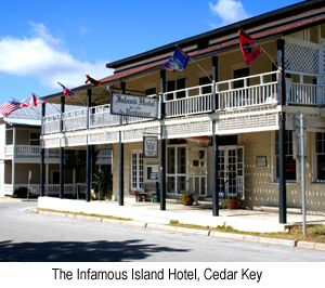 As a Jimmy Buffett fan, I was drawn to Cedar Key by the mention of it in the song, “Incommunicado”.  We didn’t find Travis McGee, but we did check out the legendary Island Hotel where Jimmy has been known to visit and serenade residents in the Neptune Bar and from the balcony above the street.  We had no surprise visit from Jimmy, but we did enjoy a memorable dinner in their quaint restaurant surrounded by local celebrities, guests and the ghosts of the Island Hotel legend.  The historic hotel was built as a General Store in 1859, but as early as 1884 had a restaurant with lodging upstairs.  Through the years legends of the resident ghosts have given the Hotel a colorful story and unique publicity.  I was skeptical of the stories, but upon being asked, our waitress told us of her “sighting”.  We were glad we had booked our suite out over the bay.