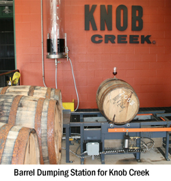 We began our tour at the huge Jim Beam Distillery, just north of Bardstown, KY. The Jim Beam family of bourbons is the #1 selling bourbon in the world. They offer an interactive tour that gives you a good understanding of the distiller’s process. We followed the path of distillation from mixing the secret blend of corn, rye and barley malt with local spring water, cooking the mash, adding sour mash and yeast, fermenting and distilling the “beer” into “white dog”. The white dog, basic moonshine, is then aged in new oak barrels which have been charred inside. The charred oak, over the 2 to 12 year aging, gives the bourbon its rich color and taste.