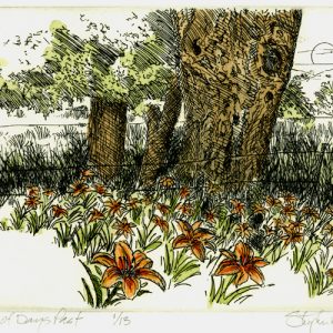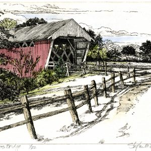 The prints below are original, photo-polymer etchings and relief prints, copper plate etchings and linocuts (linoleum block prints) produced entirely in my own printmaking studio from scenes and locations found on our backroads travel.  Each print is inked and hand-printed, one at a time, on my Takach Etching Press in a strictly limited edition before the plate is retired.  The colored prints are produced as black and white prints, either intaglio or relief prints, and are then individually watercolored to add accents and interest.  All prints will be sold matted, not framed, with an off-white, acid-free mat and acid-free foamcore backing. Each print comes with a Certificate of Authenticity, assuring you of an original, limited edition print. Click here for an example of the matting and certificate.