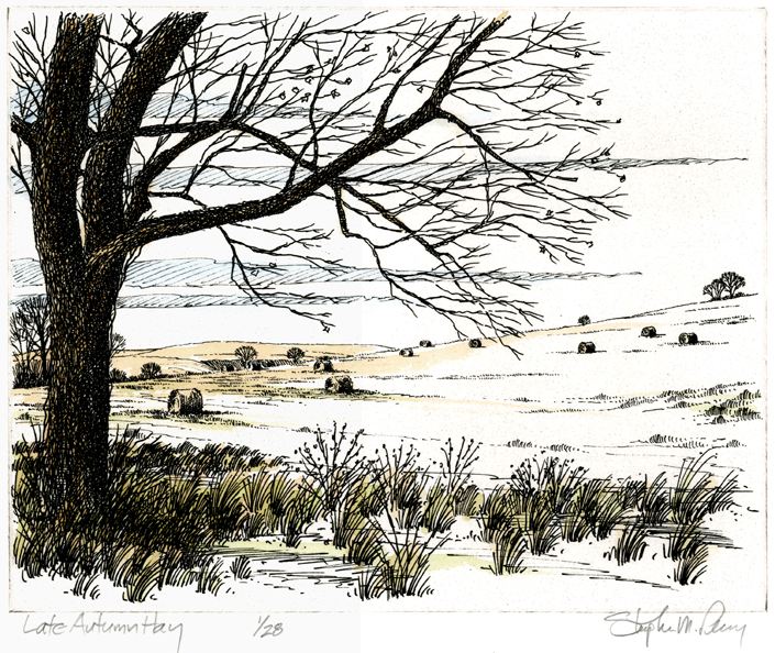 This pen and ink sketch was done in 2010 and has been converted to an original etching using the Solarplate method.  Watercolor tints were added by hand following the printing process.