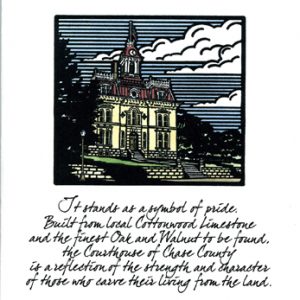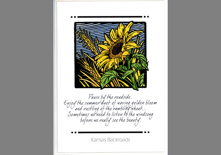 This notecard, Roadside Duet, is a reproduction of an original photo-polymer relief print of the same title.  The illustration depicts the essence of the Kansas roadsides which often are a mixture of wild Kansas Sunflowers and volunteer wheat that has escaped from the nearby fields.